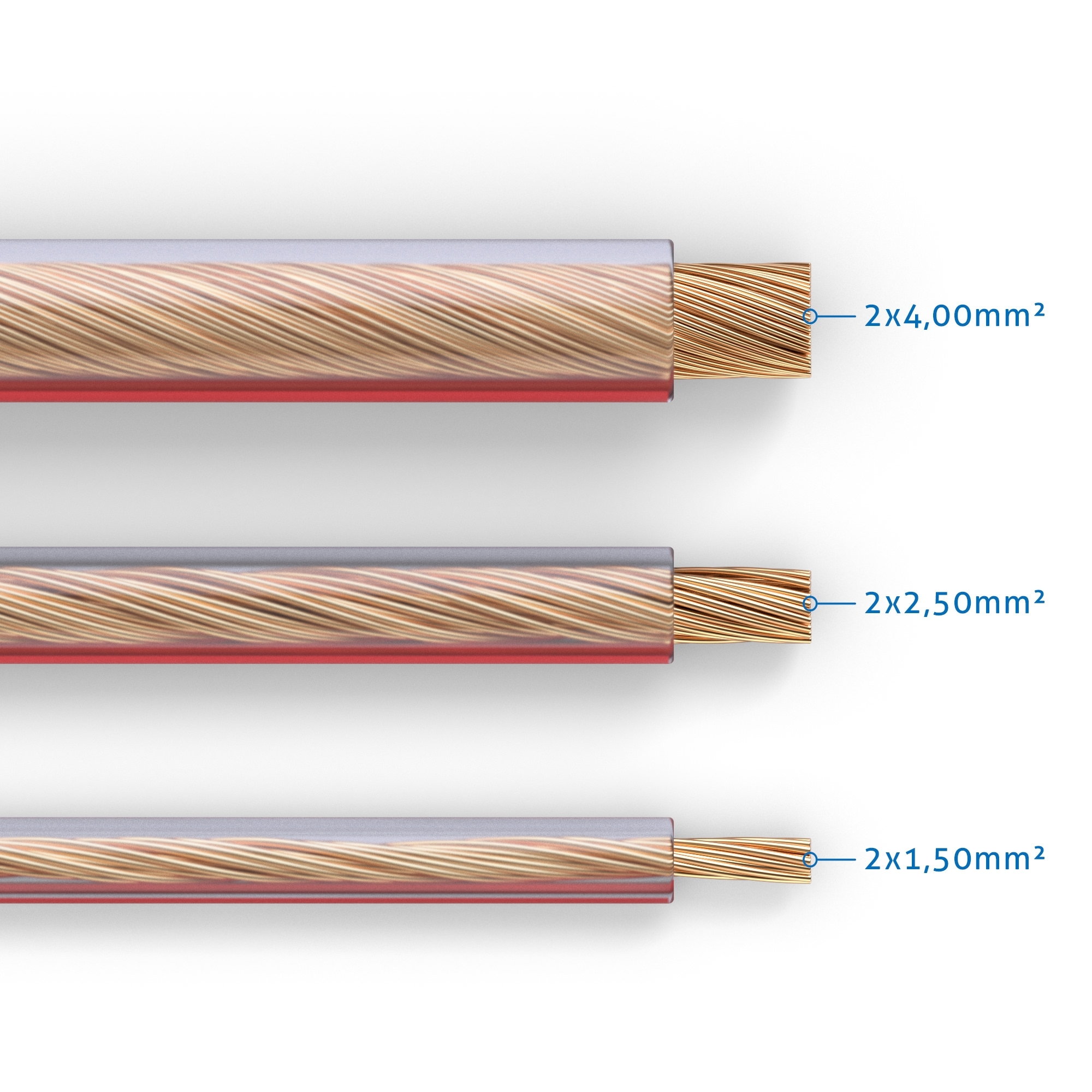 Ein reines Kupferkabel - Made in GermanyDie großen Vorteile von reinen OFC (oxygen free copper) Kupferkabeln sind deren hervorragende elektrische Leiteigenschaften sowie der geringe Leitungswiderstand.Oft werden Lautsprecherkabel als „reine" Kupferkabel ausgegeben, obwohl sie lediglich über eine hauchdünne Kupferbeschichtung verfügen.Das betrifft hauptsächlich die als „CCA-Kupfer" (Aluminiumkern mit dünner Kupferbeschichtung) oder „CCS-Kupfer" (Stahlkabel mit dünner Kupferbeschichtung) ausgewiesenen Kabel. Diese Kabel haben weitaus schlechtere Übertragungseigenschaften als OFC-Kupferkabel!Verschiedene Kabel-Querschnitte je nach AnforderungGenerell gilt: Je länger das Lautsprecherkabel, desto größer der Leistungsverlust, der sich jedoch ausschließlich in der Lautheit des Signals am Lautsprecherende bemerkbar macht.Da einem Leistungsverlust mit einer Erhöhung des Kabelquerschnitts entgegengewirkt werden kann, ist es je nach Kabellänge sinnvoll, Kabel mit unterschiedlichen Querschnitten zu verwenden (z. B. größerer Querschnitt bei den Rear-Speakern einer Surround-Installation).Bei einer Länge von 10m betragen die Leistungseinbußen ungefähr:- 0,75mm² Kabel: 5,25%- 1,5mm² Kabel: 3,13%- 2,5mm² Kabel: 1,63%- 4mm² Kabel: 1,00%Kabelmantel:- Flexibel und robust- Farbe: transparent- Metermarkierung: Ja- Polaritätskennzeichnung: JaDieses Kabel (2,5mm²) ist verfügbar in den folgenden Längen:10m / 15m / 20m / 25m / 30m / 50m / 100m / 50m / 100m