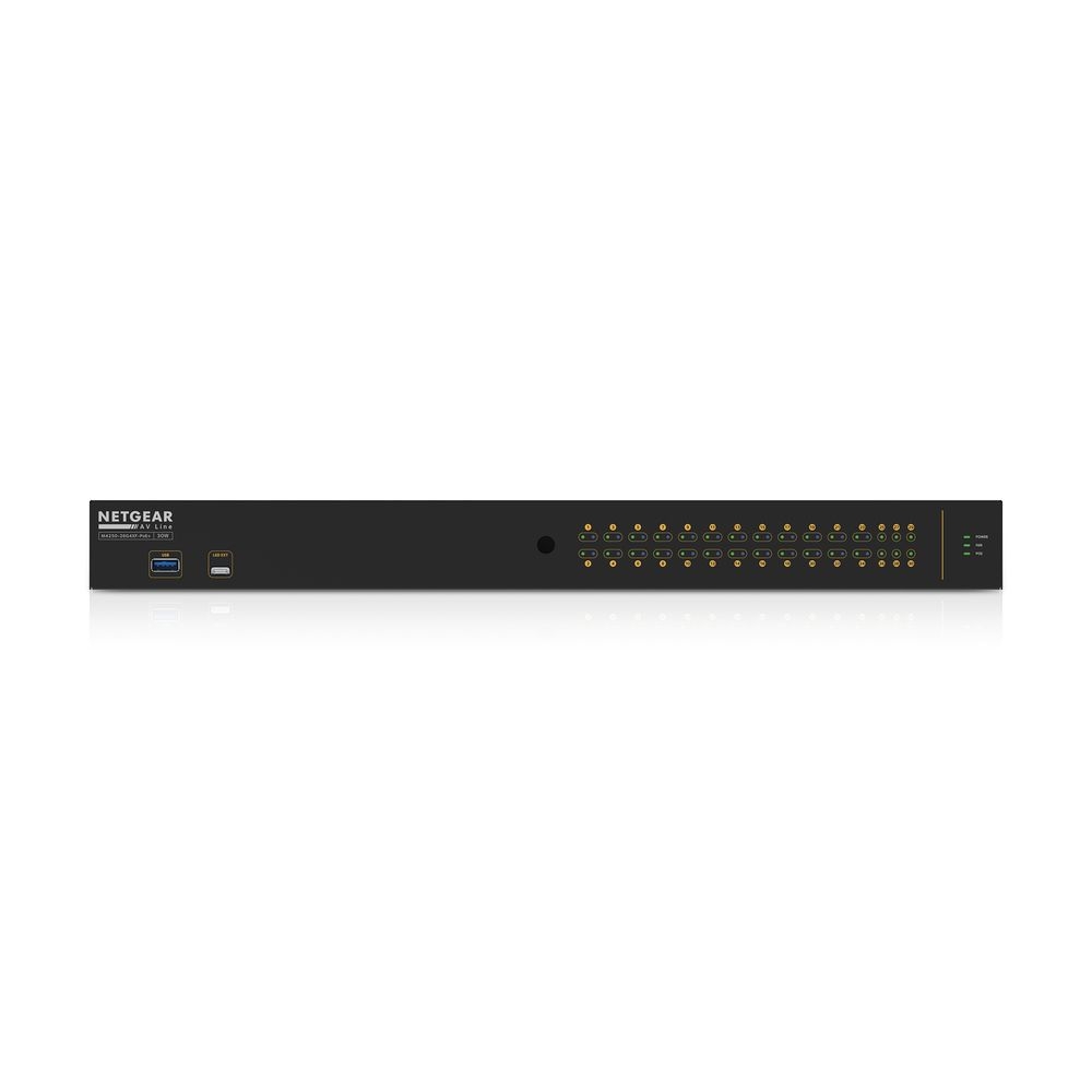 24 PoE+-fähige Ports: 24 der Ethernet-Ports liefern Power over Ethernet Plus (PoE+) und versorgen kompatible AV-Geräte sowohl mit Daten als auch mit Strom. Dies reduziert die Komplexität der Verkabelung und erleichtert die flexible Platzierung der Geräte.