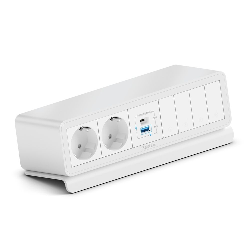 Preconfigured with two DE/EU AC sockets, one 65W PD module & four blanks