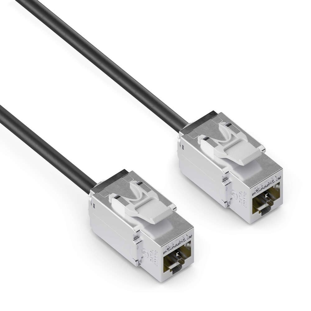 Robust Shielded Keystone Modules: Both ends terminate in zinc diecast shielded RJ45 keystone modules with gold-plated pins. This configuration ensures durable mechanical performance and reliable signal integrity, addressing the demands of frequent use in modular AV connection systems.