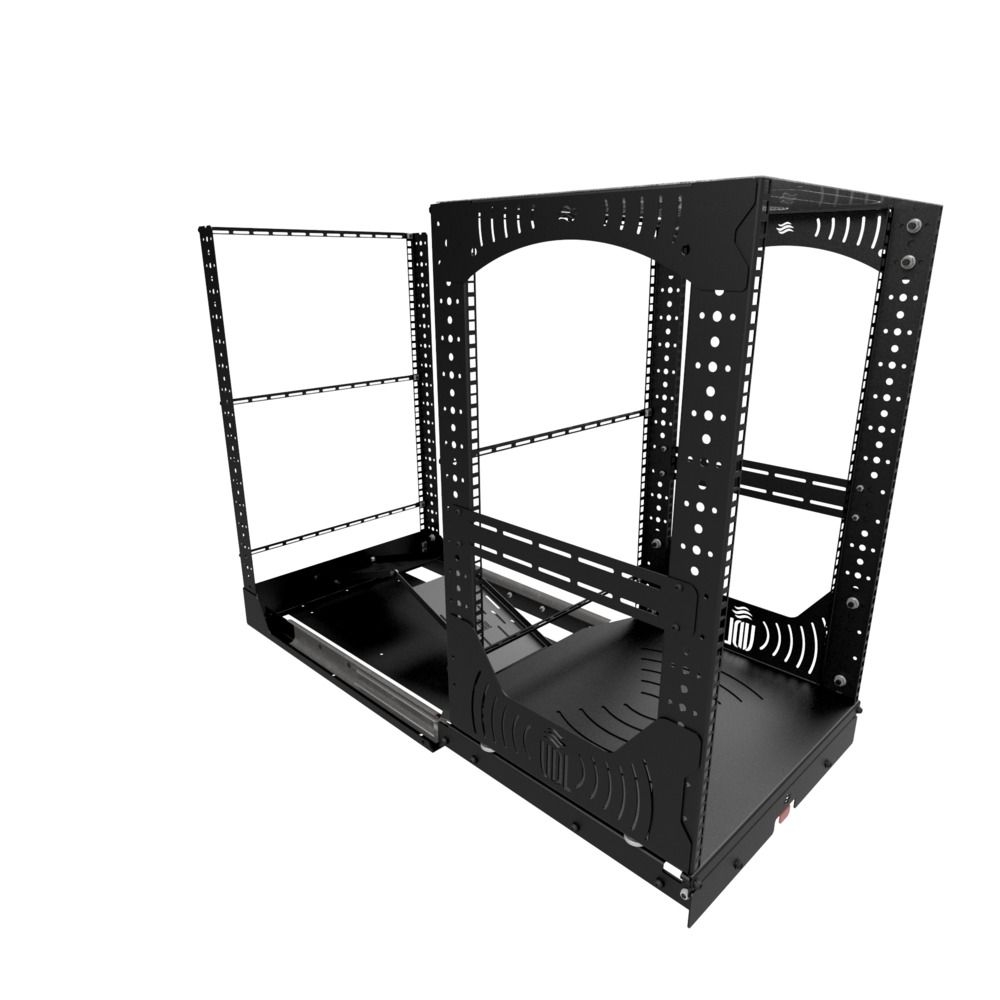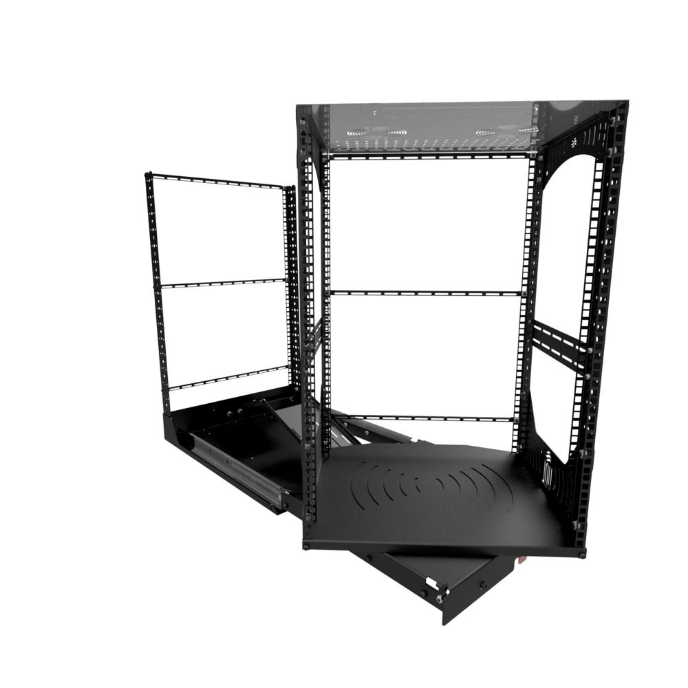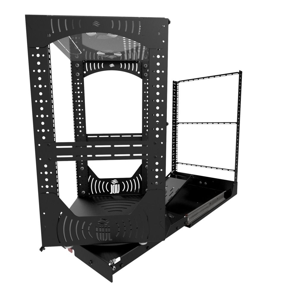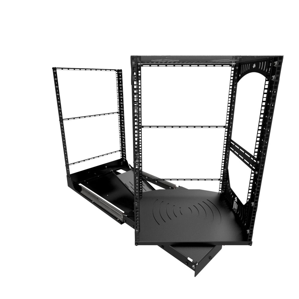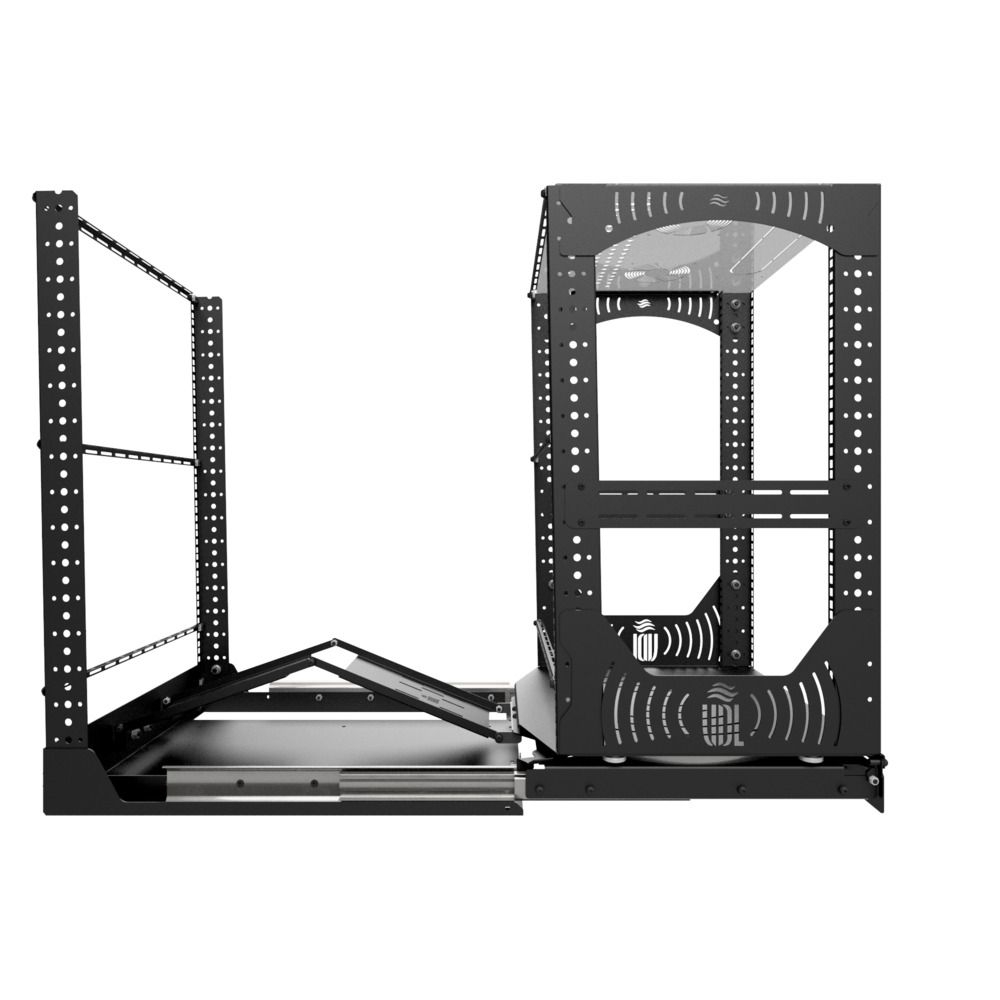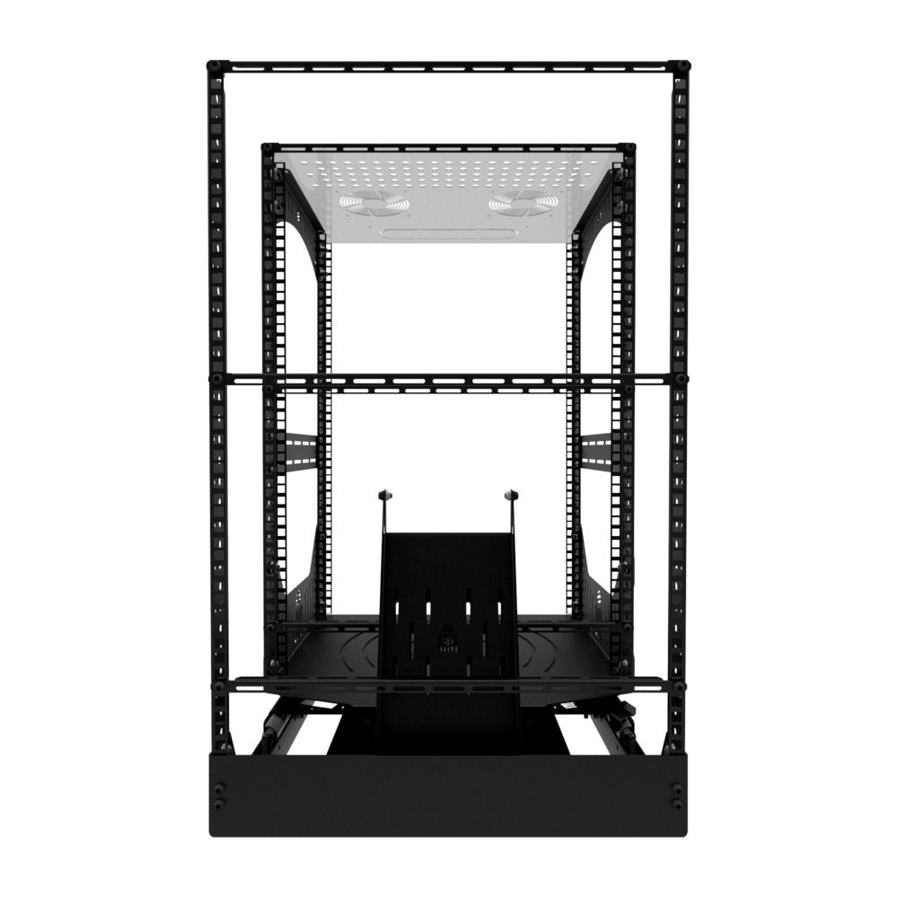 Diseñada para mayor comodidad, la base del rack se desliza fácilmente, se bloquea en su sitio y gira 180° para un acceso rápido durante la instalación o el mantenimiento. Con las placas de gestión de cables y los perfiles en L incluidos, la organización de cables y componentes se realiza sin problemas. Los montajes opcionales de ventilador en el panel superior proporcionan opciones de refrigeración eficientes.