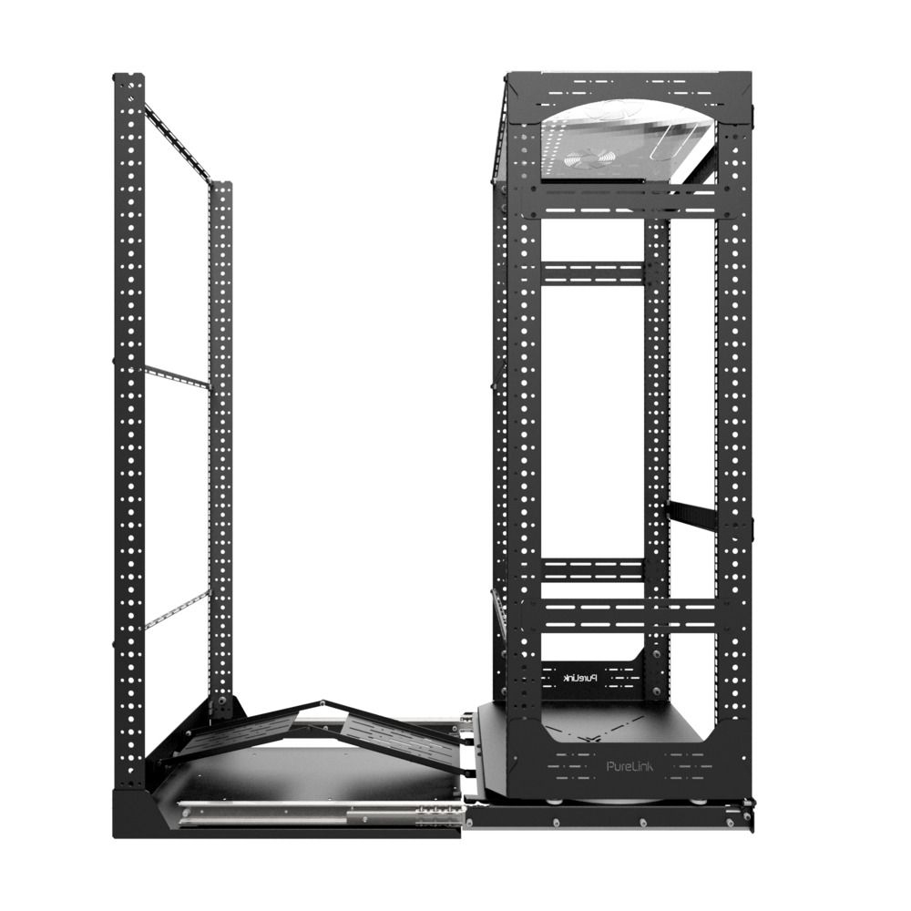 Su sistema de bloqueo de doble seguridad garantiza que la estantería permanezca firmemente en su sitio, evitando que se deslice o gire accidentalmente durante su uso. La base del rack se desliza fácilmente hacia fuera y gira 180°, proporcionando un acceso sin esfuerzo para la instalación y el mantenimiento. Las placas de gestión del cableado y los perfiles de los raíles en L mantienen los equipos organizados, mientras que los puntos de instalación de ventiladores opcionales en la parte superior del rack ofrecen soluciones de refrigeración eficientes.