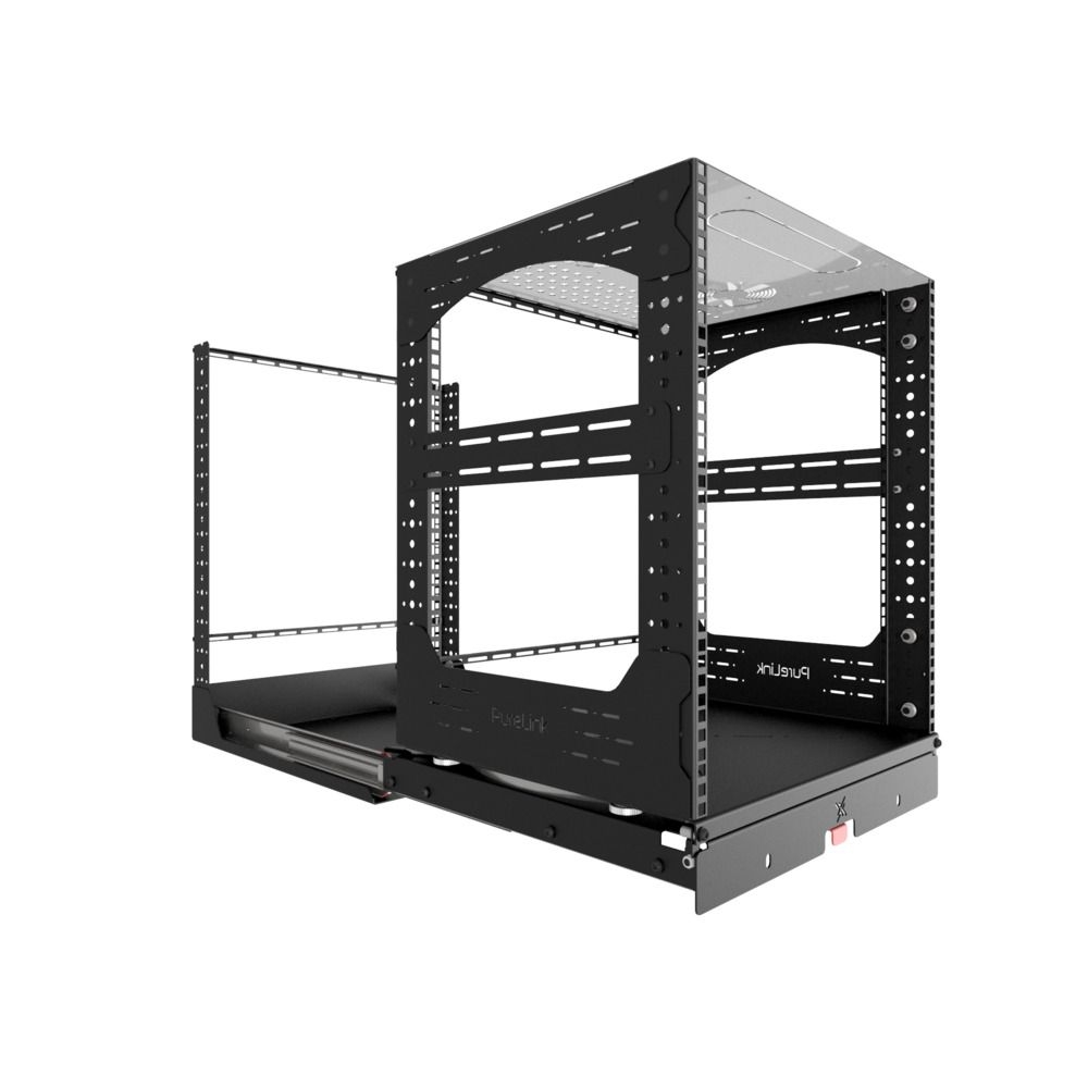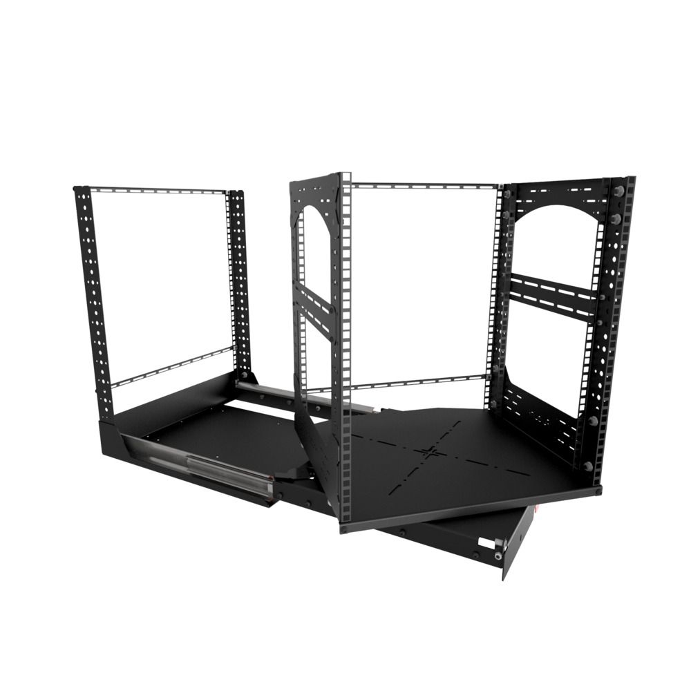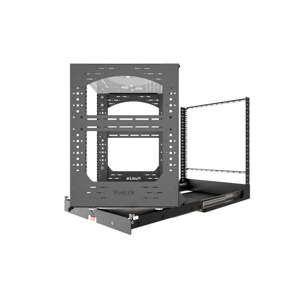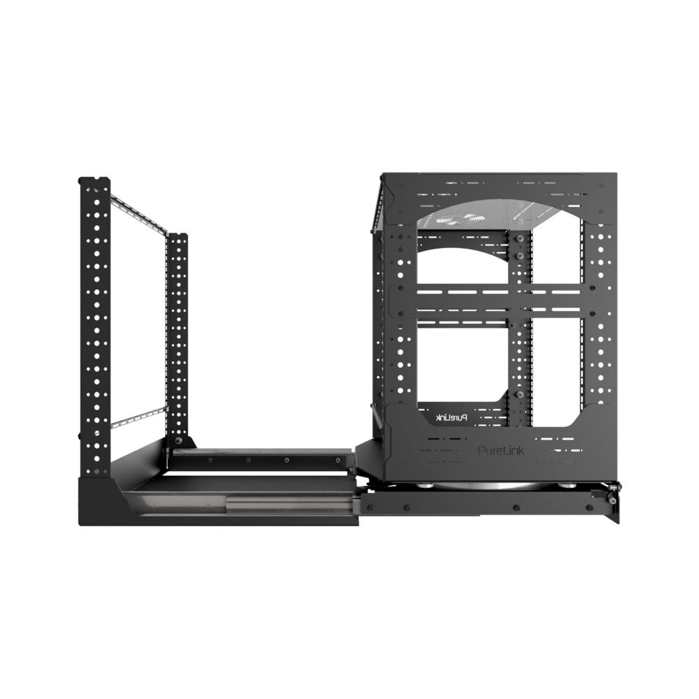 Baie rotative frontale amovible: La baie frontale se détache et pivote indépendamment, offrant un accès dégagé aux appareils montés à l'avant et aux terminaisons de câbles. Cette conception facilite le remplacement rapide des équipements et le passage efficace des câbles dans les déploiements AV à haute densité.