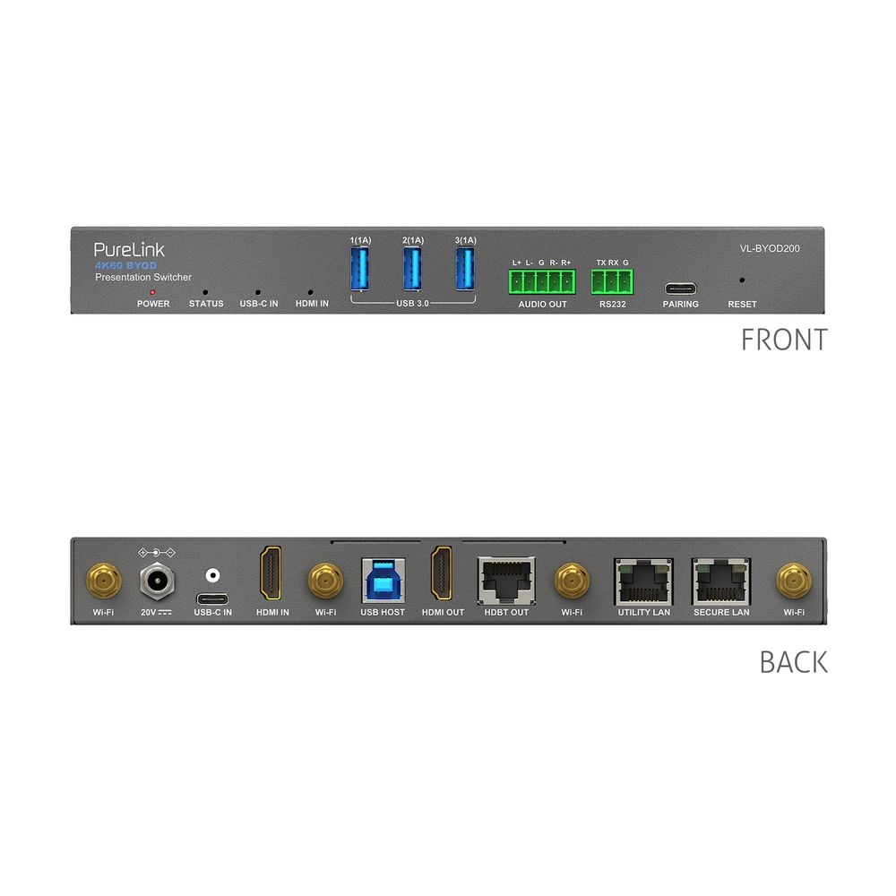 Il VL-BYOD200 integra più ingressi e uscite AV ad alta risoluzione in un'unica unità, supportando la connettività HDMI, USB-C e HDBaseT per un instradamento flessibile del segnale in sale riunioni, spazi di lavoro collaborativi e ambienti ibridi. L'architettura del dispositivo si adatta sia ai flussi di lavoro di presentazione cablati che wireless, consentendo una perfetta integrazione dei dispositivi degli utenti tramite AirPlay Mirroring, Miracast, Chromecast e dongle dedicato. Con funzionalità di collaborazione integrate, opzioni di gestione della rete e alimentazione USB-C, questo switcher semplifica l'infrastruttura AV per gli spazi che richiedono commutazione rapida, ricarica dei dispositivi e accesso sicuro alla rete.