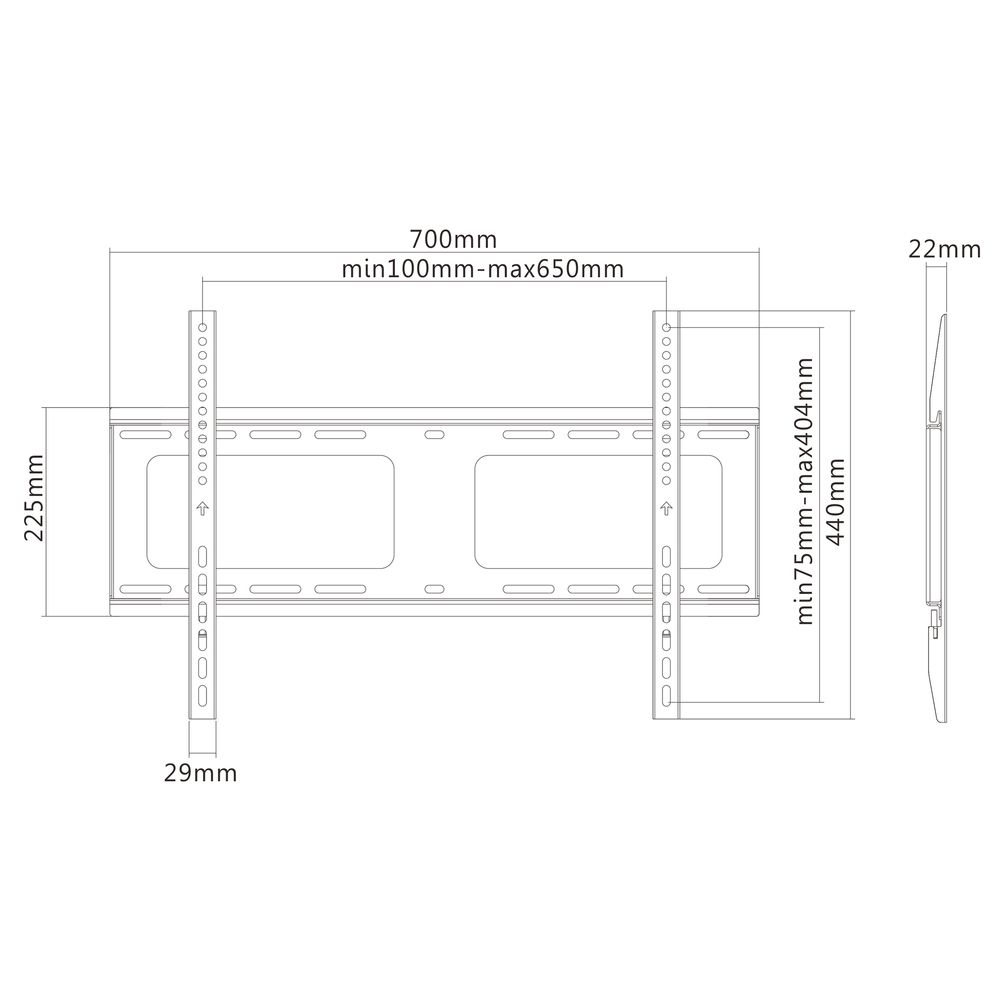Minimale wandafstand: 22 mm: Met een totale wandafstand van slechts 22 mm maakt de beugel het mogelijk om displays dicht bij het montageoppervlak te plaatsen. Dit zorgt voor een gestroomlijnd uiterlijk, met name in omgevingen waar ruimte-efficiëntie en onopvallende integratie prioriteit hebben.