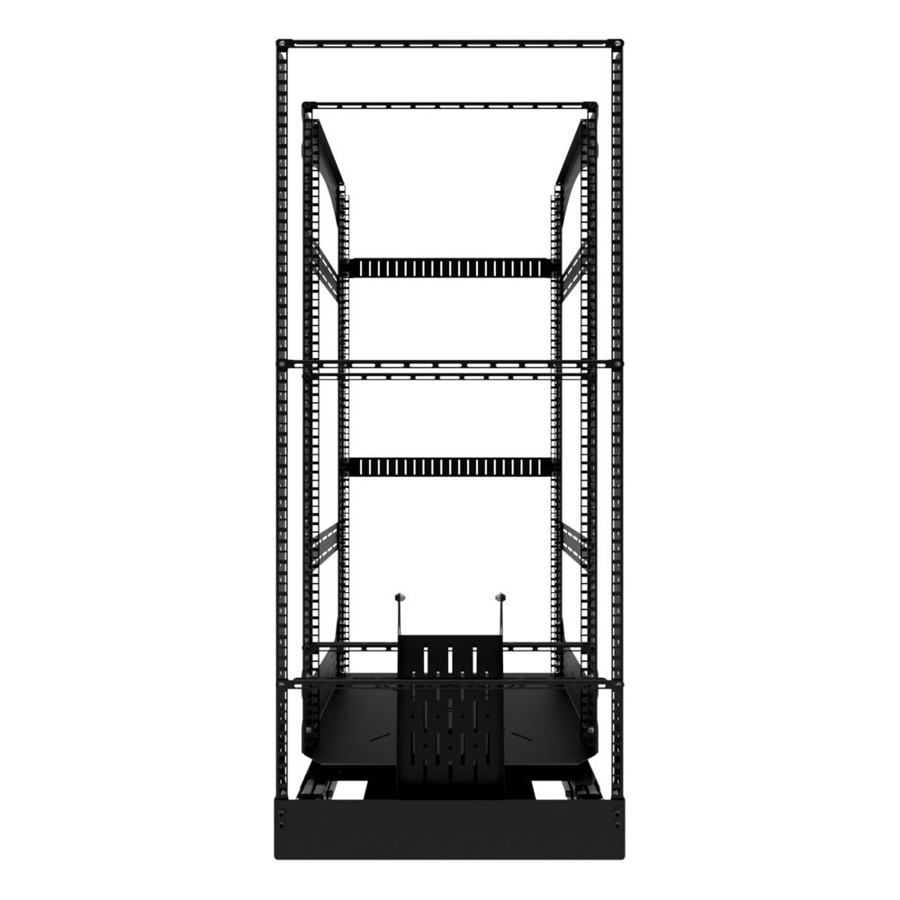 Het dubbele veiligheidsslot zorgt ervoor dat het rek goed op zijn plaats blijft en niet per ongeluk verschuift of draait tijdens gebruik. De basis van het rack schuift gemakkelijk uit en draait 180°, zodat installatie en onderhoud moeiteloos kunnen worden uitgevoerd. Wire management platen en L-rail profielen houden de apparatuur georganiseerd, terwijl optionele ventilator installatiepunten op de racktop efficiënte koeloplossingen bieden.